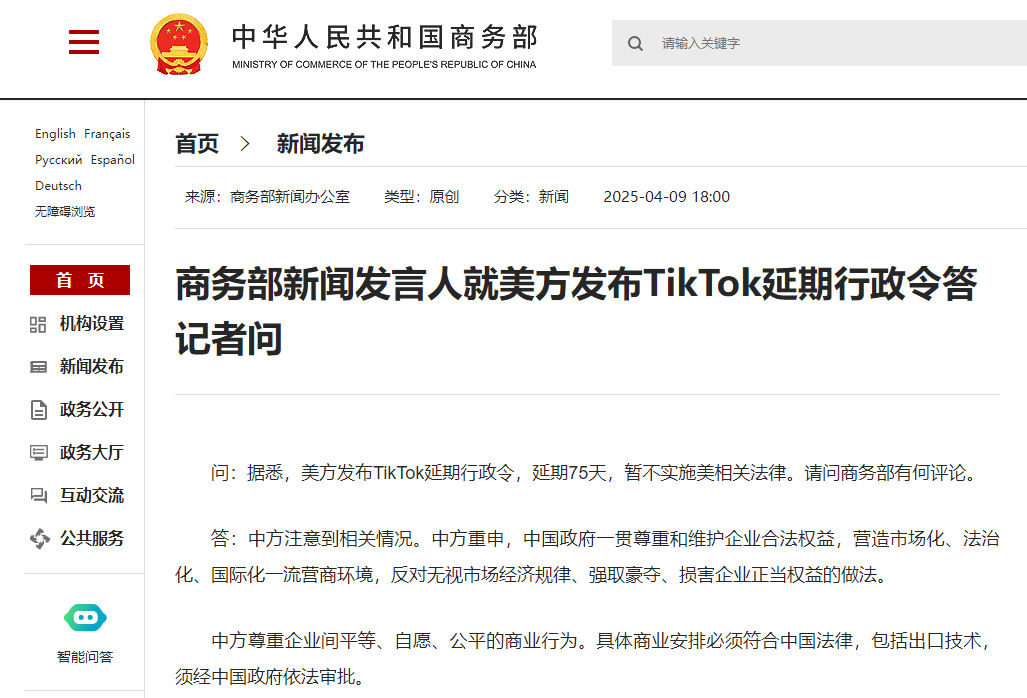 4月9日,商务部新闻发言人就美方发布TikTok延期行政令答记者问。商务部新闻发言人表示,中方重申,中国政府一贯尊重和维护企业合法权益,营造市场化、法治化、国际化一流营商环境,反对无视市场经济规律、强取豪夺、损害企业正当权益的做法。